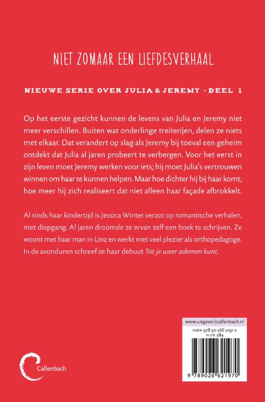 Met haar debuut ‘Tot je weer ademen kunt’ begint Jessica Winter een serie jeugdromans die de fans van Jennifer Smith en Maaike en Domenico zal aanspreken. Op het eerste gezicht kunnen de levens van Julia en Jeremy niet meer verschillen. Buiten wat onderlinge treiterijen delen ze niets met elkaar. Dat verandert op slag als Jeremy bij toeval een geheim ontdekt dat Julia al jaren probeert te verbergen. Voor het eerst in zijn leven moet Jeremy werken voor iets; hij moet Julia’s vertrouwen winnen om haar te kunnen helpen. Maar hoe dichter hij bij haar komt, hoe meer hij zich realiseert dat niet alleen haar façade afbrokkelt. Al sinds haar kindertijd is Jessica Winter verzot op romantische verhalen, met diepgang. Al jaren droomde ze ervan zelf een boek te schrijven. Ze woont met haar man in Linz en werkt met veel plezier als orthopedagoge. In de avonduren schreef ze ‘Tot je weer ademen kunt’.