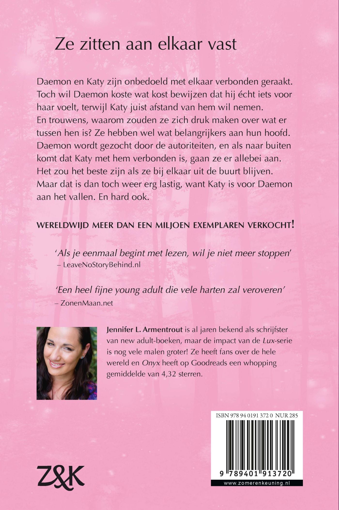‘Onyx’ is het tweede deel van de vijfdelige fantasyserie ‘Lux’ van Jennifer L. Armentrout. Katy valt in dit boek tegen beter weten in steeds meer voor Daemon, terwijl het juist van het grootste belang is dat niemand weet dat zij met elkaar verbonden zijn. Dat zou namelijk haar dood worden. En die van Daemon net zo goed, trouwens. Ze moet tegen hem liegen om bij hem uit de buurt te blijven, hoe zwaar haar dat ook valt. ‘Onyx’ gaat meteen verder waar het vorige deel van Jennifer L. Armentrouts ‘Lux’-serie ‘Obsidian’ ophield. Hierna volgen nog drie delen.