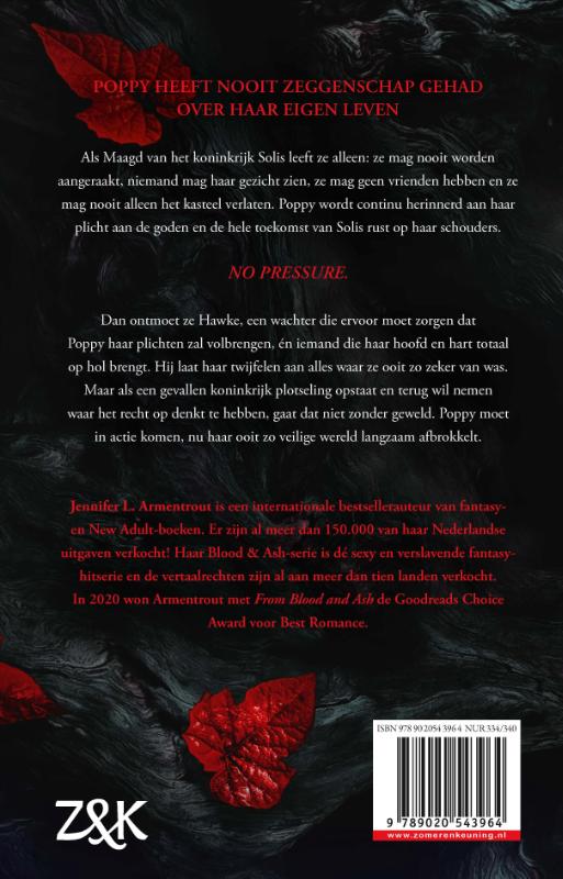 'Uit bloed en as' van Jennifer L. Armentrout gaat over Poppy, die nooit zeggenschap heeft gehad over haar eigen leven. Als Maiden leeft ze alleen: ze wordt nooit aangeraakt, nooit naar haar omgekeken en nooit met haar gesproken. De hele toekomst van het rijk rust op haar schouders, want ze moet tijdens haar Ascension waardig worden bevonden door de goden. Hoe kan ze ooit aan die verwachtingen voldoen? Dan ontmoet ze Hawke, een bewaker die ervoor moet zorgen dat Poppy haar Ascenion zal volbrengen, én iemand die haar hoofd en hart totaal op hol brengt. 'Uit bloed en as' is het eerste deel van de bloedstollende nieuwe Blood and Ash-serie van Armentrout. Armentrout won met dit boek de Goodreads Choice Award Best Romance 2020.