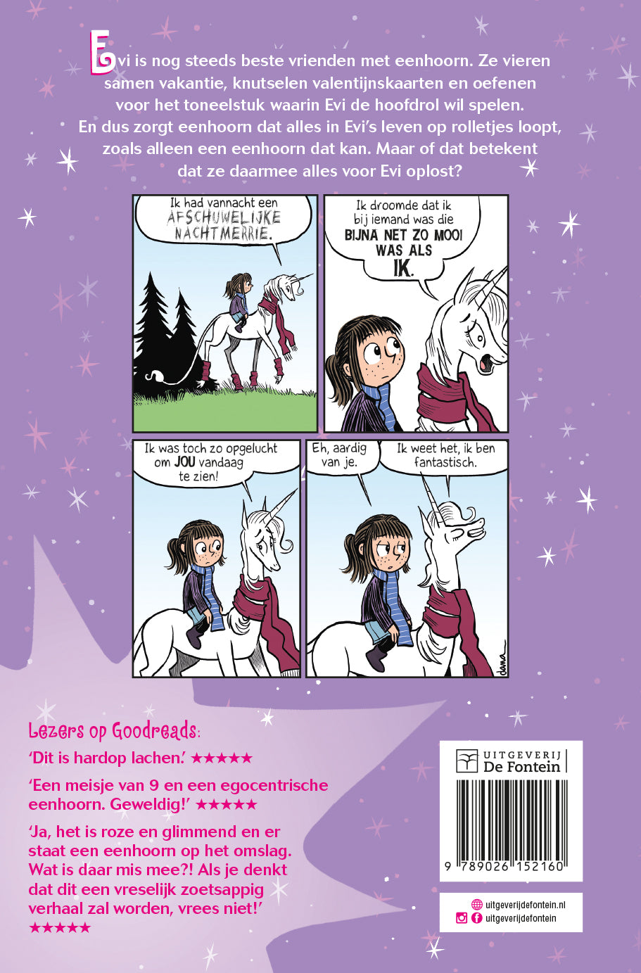 Evi is nog steeds beste vrienden met eenhoorn. En dus zorgt eenhoorn dat alles in Evi’s leven op rolletjes loopt, zoals alleen een eenhoorn dat kan. Met humor.