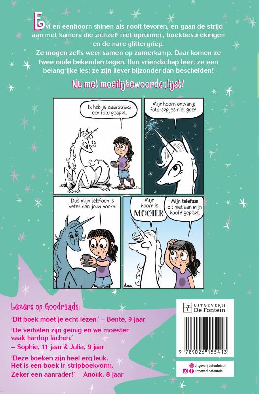 Evi en eenhoorn shinen als nooit tevoren. Zelfs als ze geconfronteerd worden met nare glittergriep en kamers die zichzelf niet opruimen. Basisschoolproblemen en de worsteling om jezelf te zijn, vermengd met narcisme (eenhoorn), sarcasme (Evi) en een vleugje magie. Deze serie is smullen voor heel veel leeftijden.