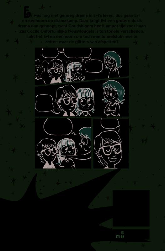 Er was nog niet genoeg drama in Evi’s leven, dus gaan Evi en eenhoorn op dramakamp. Daar krijgt Evi een grotere dosis drama dan gehoopt, want Goudsbloem heeft amper tijd voor haar: zus Cecile Onfortuinlijke Neusvleugels is ten tonele verschenen.