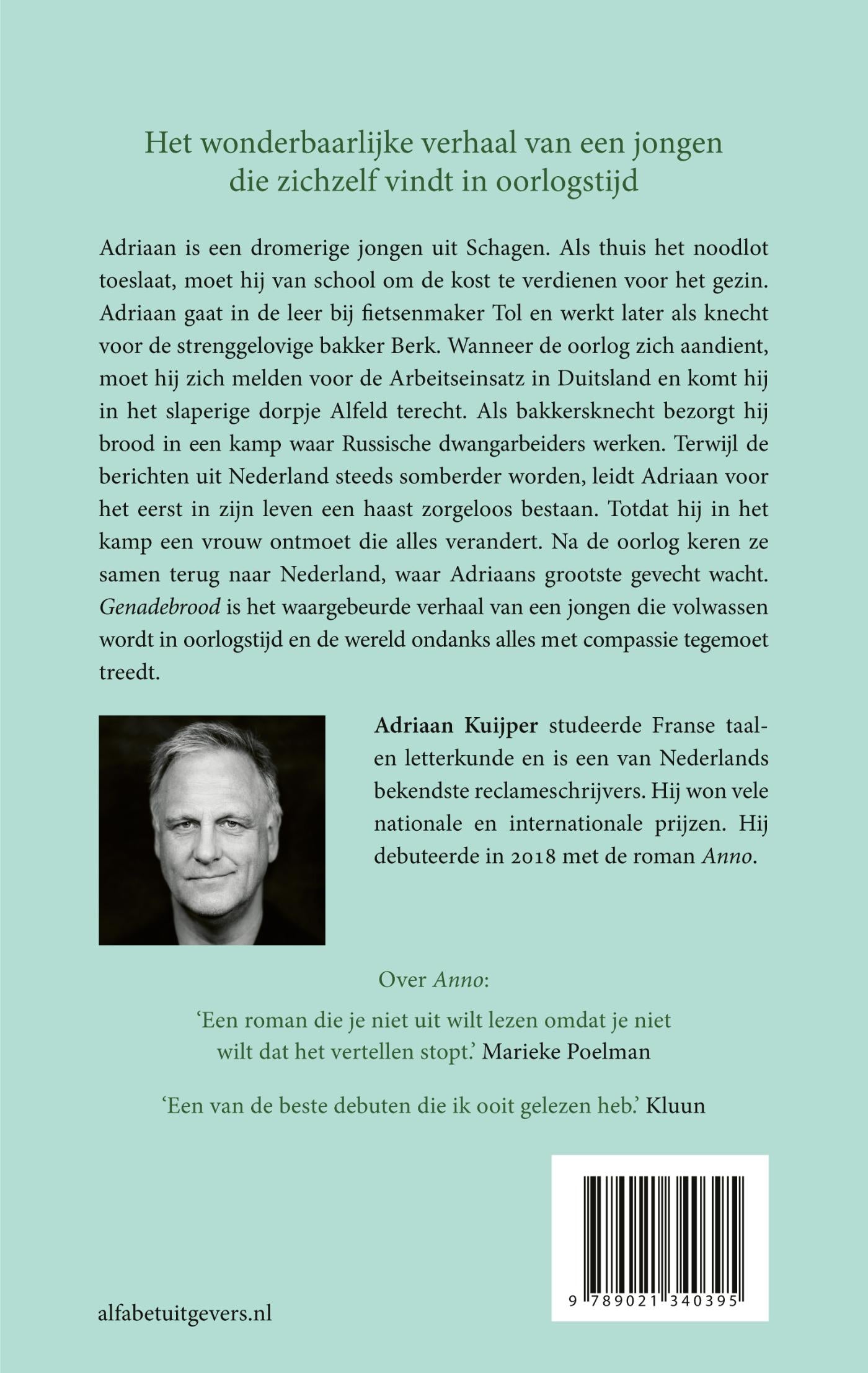 Adriaan is een dromerige jongen uit Schagen. Als thuis het noodlot toeslaat moet hij op jonge leeftijd van school om de kost te verdienen voor het gezin. Adriaan gaat in de leer bij fietsenmaker Tol en werkt enige jaren als knecht voor de strenggelovige bakker Berk. Wanneer de oorlog zich aandient, moet hij zich melden voor de Arbeitseinsatz in Duitsland en komt hij na een vlucht uit de trein in het slaperige dorpje Alfeld terecht. Als bakkersknecht bezorgt hij aan de overkant van de rivier brood in een kamp waar Russische dwangarbeiders werken. Terwijl de berichten uit Nederland steeds somberder worden, leidt Adriaan voor het eerst in zijn leven een haast zorgeloos bestaan. Totdat hij in het kamp een vrouw ontmoet die alles verandert. Na de oorlog keren ze samen terug naar Nederland, niet wetend dat daar Adriaans grootste gevecht wacht. ‘Genadebrood’ is het waargebeurde verhaal van een jongen die volwassen wordt in oorlogstijd en de wereld ondanks alles met compassie tegemoet treedt.