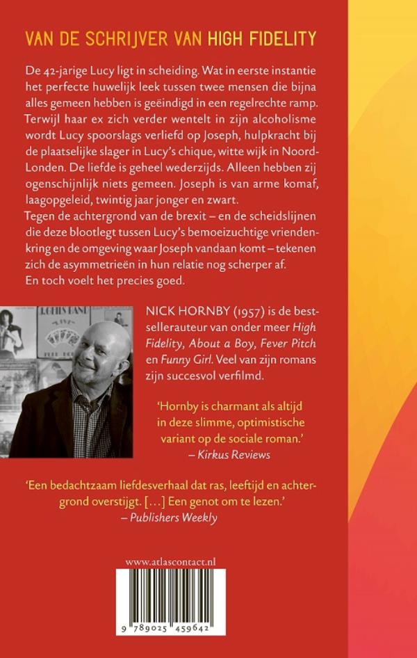‘Op het eerste gezicht’, de nieuwe roman van bestsellerauteur Nick Hornby. De 42-jarige Lucy ligt in scheiding. Wat in eerste instantie het perfecte huwelijk leek tussen twee mensen die bijna alles gemeen hebben is geëindigd in een regelrechte ramp. Terwijl haar ex zich verder wentelt in zijn alcoholisme wordt Lucy spoorslags verliefd op Joseph, hulpkracht bij de plaatselijke slager in Lucy’s chique, witte wijk in Noord-Londen. De liefde is geheel wederzijds. Alleen hebben zij ogenschijnlijk niets gemeen. Joseph is van arme komaf, laagopgeleid, twintig jaar jonger en zwart.