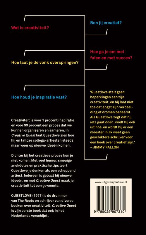 In 'Creative Quest' laat Questlove zien hoe hij en talloze collega-artiesten, waaronder Björk, Elvis Costello, Pharrel Williams en Malcolm Gladwell, steeds maar weer op nieuwe ideeën komen. Dichter bij het creatieve proces kun je niet komen. Met veel humor, smeuïge anekdotes en praktische tips leert Questlove je denken als een scheppend artiest.