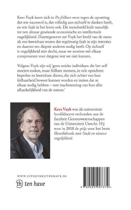 Daartegenover zet Vuyk, winnaar van de prijs voor het beste filosofieboek in 2018, de mens als een kwetsbaar wezen: we hebben elkaar ten diepste nodig. Op zichzelf is ongelijkheid niet slecht, maar welk doel dient zij? Vuyks oproep: laten we elkaar compenseren voor datgene wat we niet kunnen. Want we zijn slechts gelijk in onze feilbaarheid.