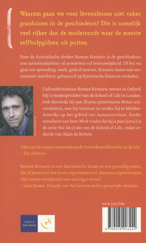 Zelfhulpgidsen zijn onderhevig aan trends. Waarom gaan we voor levenslessen dan niet grasduinen in iets dat veel rijker is dan de nieuwste modegril: de geschiedenis? Of het nu om opvoeding, werk, geld of sterven gaat, de Brits-Poolse denker Roman Krznaric, medeoprichter van de Londense School of Life, komt in 'De wonderbox' met verrassende inzichten die hij baseert op historische feiten en verhalen.
