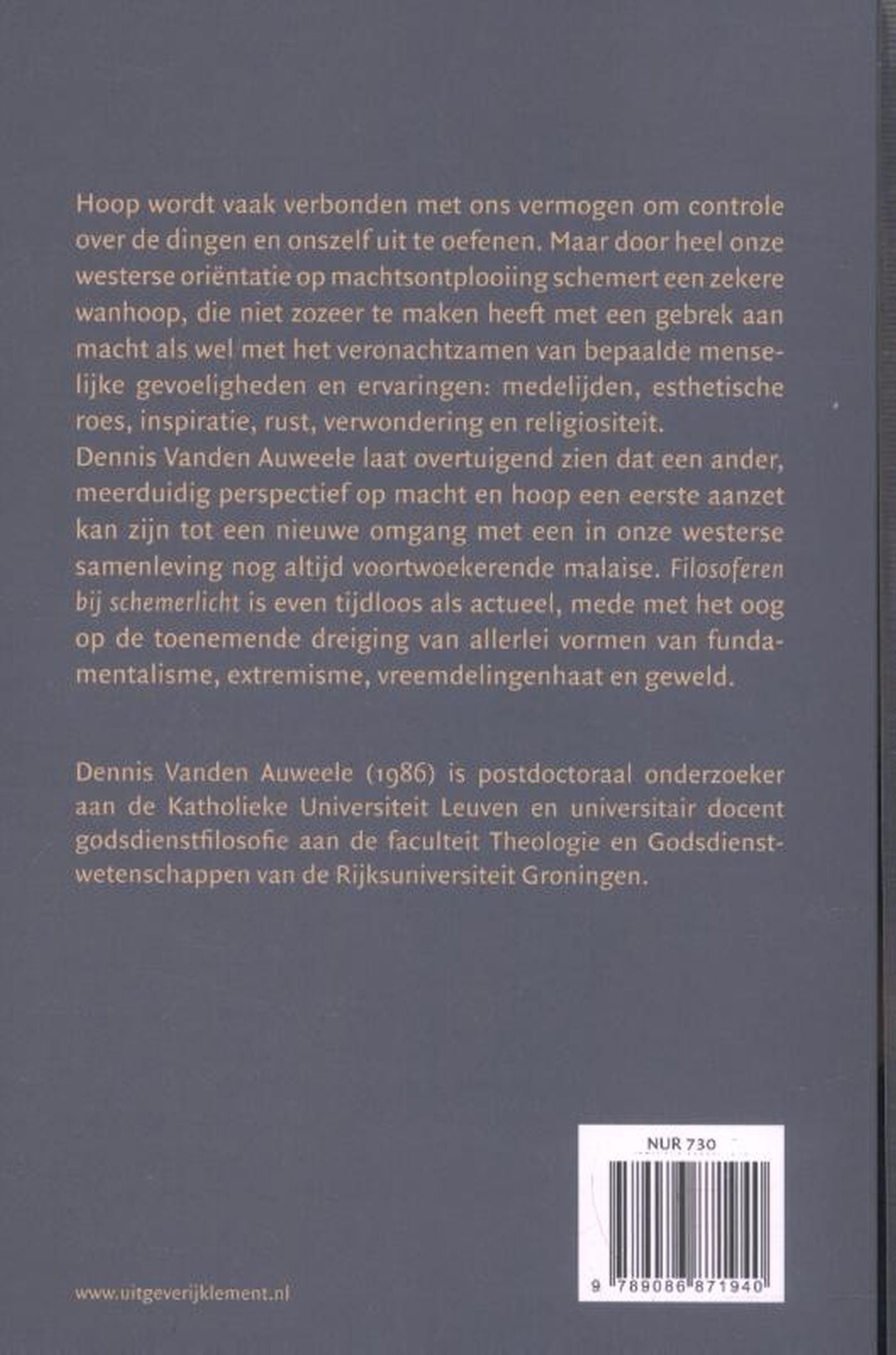 DENNIS VANDEN AUWEELE (1986) is verbonden aan het Hoger Instituut voor Wijsbegeerte van de Katholieke Universiteit Leuven. In 2014 promoveerde hij op het proefschrift 'Pessimism in Kant and Schopenhauer. On the Horror of Existence'.