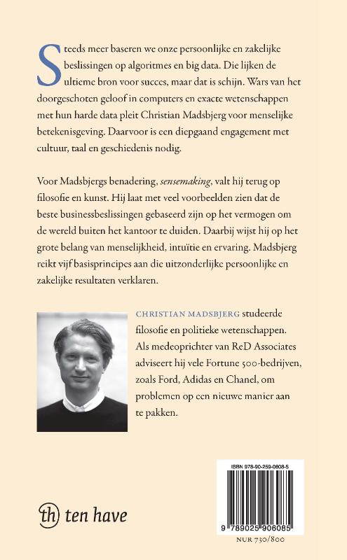 Aan de hand van sprekende voorbeelden laat Madsbjerg zien dat de wereld uit meer bestaat dan een serie algoritmes. Vanuit zijn ervaring als adviseur toont hij aan dat de meest succesvolle businessbeslissingen gebaseerd zijn op het vermogen de wereld buiten het kantoor te duiden. Menselijkheid in een wereld van big data is daarom onmisbaar.