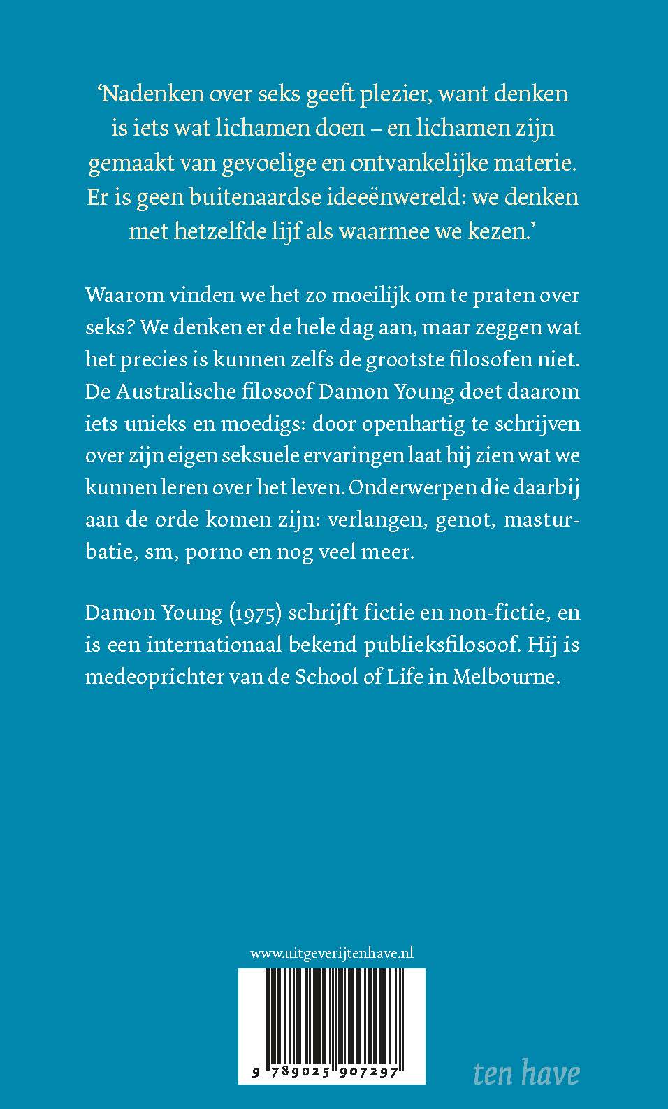 Waarom vinden we het zo moeilijk om te praten over seks? We denken er de hele dag aan, maar als we moeten zeggen wat het is, weten zelfs de grootste filosofen het niet precies. In dit nieuwe boek doet de Australische publieksfilosoof Damon Young iets unieks en moedigs: hij schrijft open over zijn eigen seksuele ervaringen en probeert te laten zien wat we daardoor kunnen leren over het leven. Onderwerpen die aan de orde komen zijn: verlangen, genot, masturbatie, sm, porno en nog veel meer.