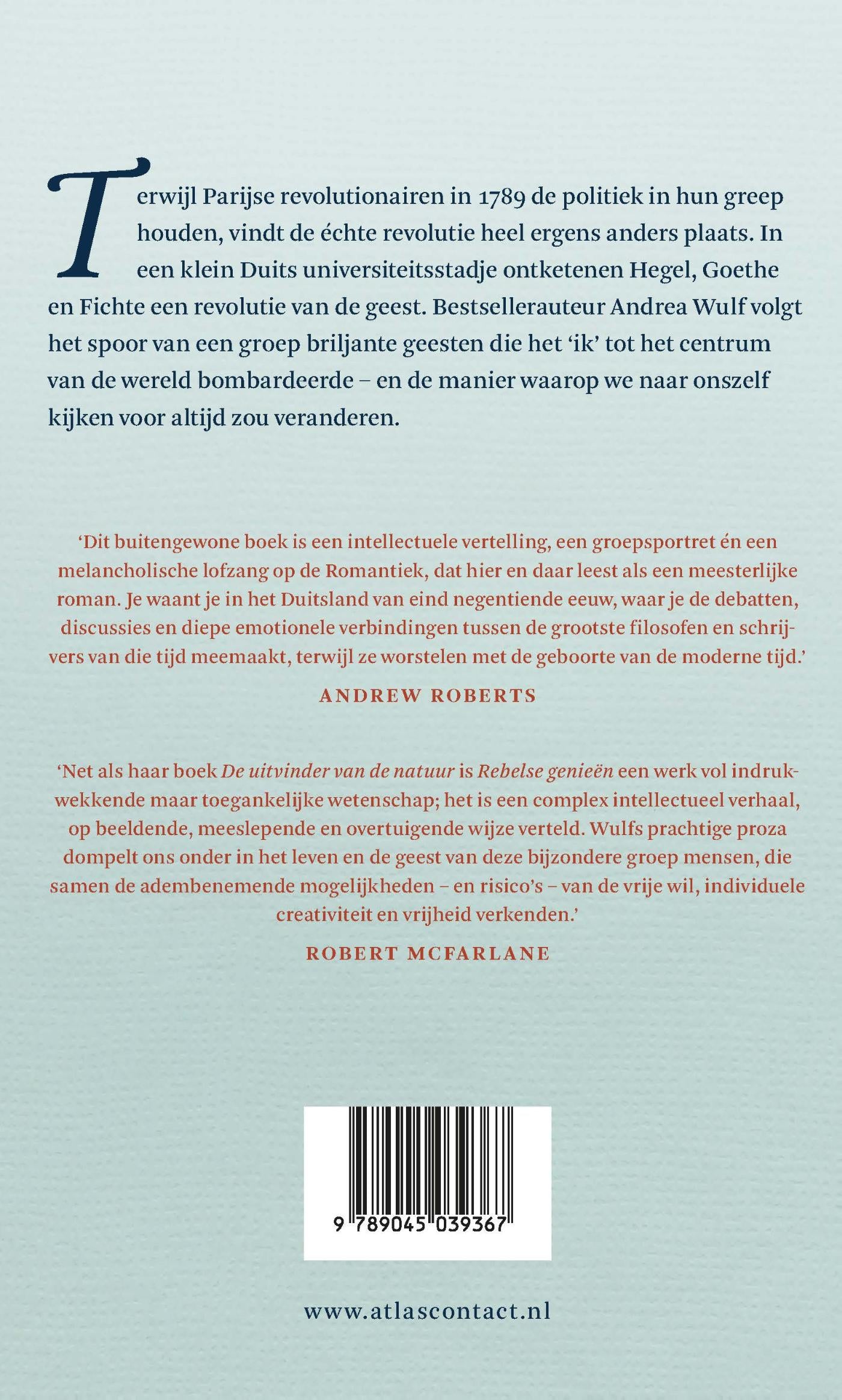 Wulf beschrijft dat de oorsprong van ideeën zoals individualisme, zelfbeschikking en vrijheid ligt in Jena, een klein Duits universiteitsstadje. Daar begon in de laatste jaren van de achttiende eeuw een bont genootschap op een radicaal nieuwe wijze na te denken over het ‘zelf’. Onder hen bevond zich de raadselachtige Caroline Schlegel. Ze filosofeerden over het scheppend vermogen van het zelf, de eenheid van de natuur en de ware aard van vrijheid – en daarmee ontketenden ze de Romantiek, een revolutie van de geest die tot op de dag van vandaag doorwerkt.
