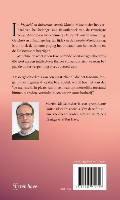In ‘Vrijheid en duisternis’ vertelt Martin Mittelmeier het verhaal van het belangrijkste filosofieboek van de twintigste eeuw: Adorno en Horkheimers ‘Dialectiek van de Verlichting’. Geschreven in ballingschap ten tijde van de Tweede Wereldoorlog, is dit boek de ultieme poging het ontstaan van het fascisme en de holocaust te begrijpen. Mittelmeier schetst een fascinerende ontstaansgeschiedenis die leest als een intellectuele thriller.