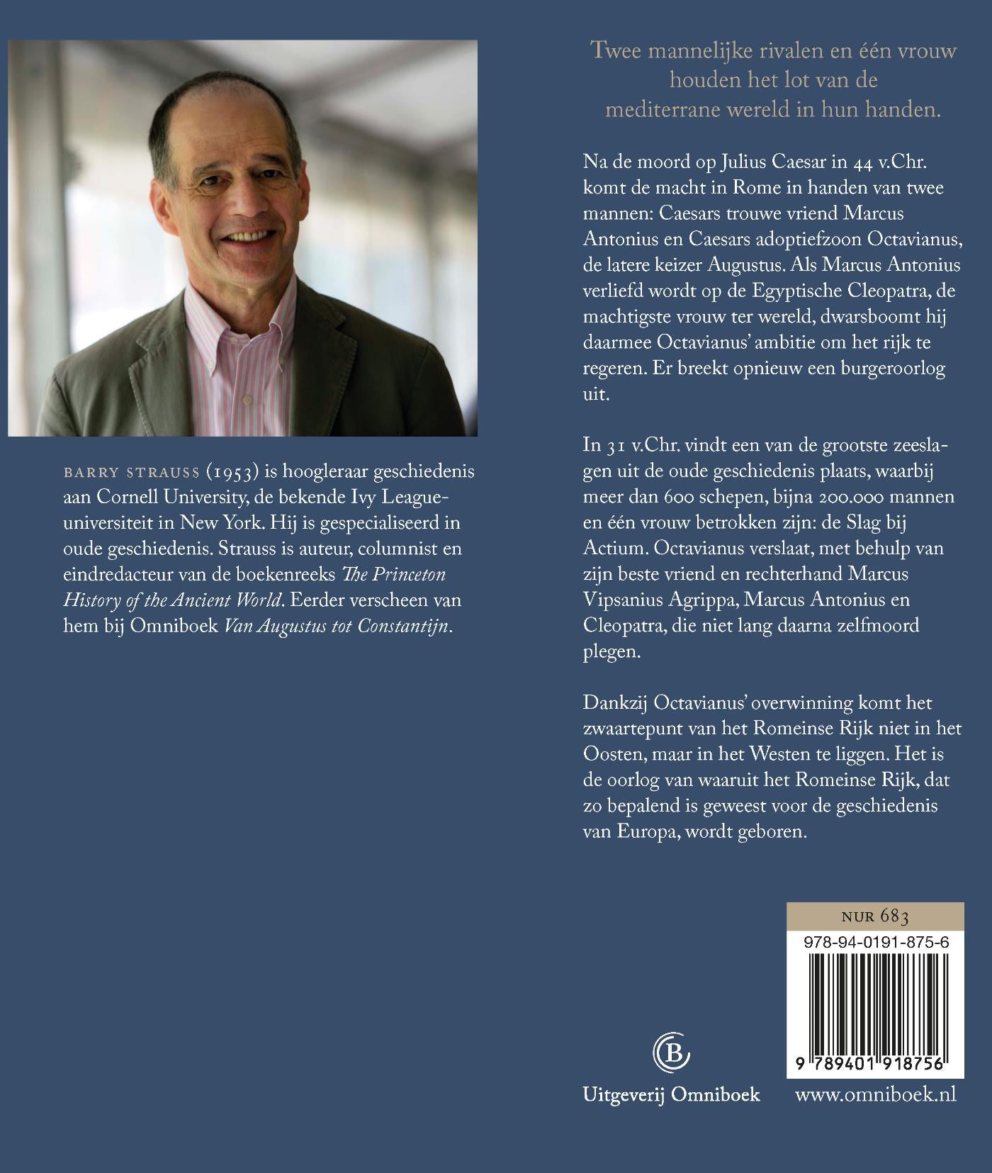 De Slag bij Actium in 31 v.Chr., die bijna 200.000 mensen het leven kostte, was een scharnierpunt in de geschiedenis. Octavianus, de latere keizer Augustus, won de zeeslag van misschien wel het bekendste liefdespaar uit de geschiedenis: Marcus Antonius en Cleopatra. Hun vloot werd bijna geheel verslagen en Marcus Antonius en Cleopatra pleegden zelfmoord. Hun drie gezamenlijke kinderen werden in Rome opgevoed door Octavia, de zus van Octavianus en ex-vrouw van Marcus Antonius. Hadden Marcus Antonius en Cleopatra gewonnen, dan was wellicht Alexandrië de hoofdstad geworden van het Romeinse Rijk. Hoogleraar geschiedenis Barry Strauss vertelt op meeslepende wijze het verhaal van deze bekende slag.