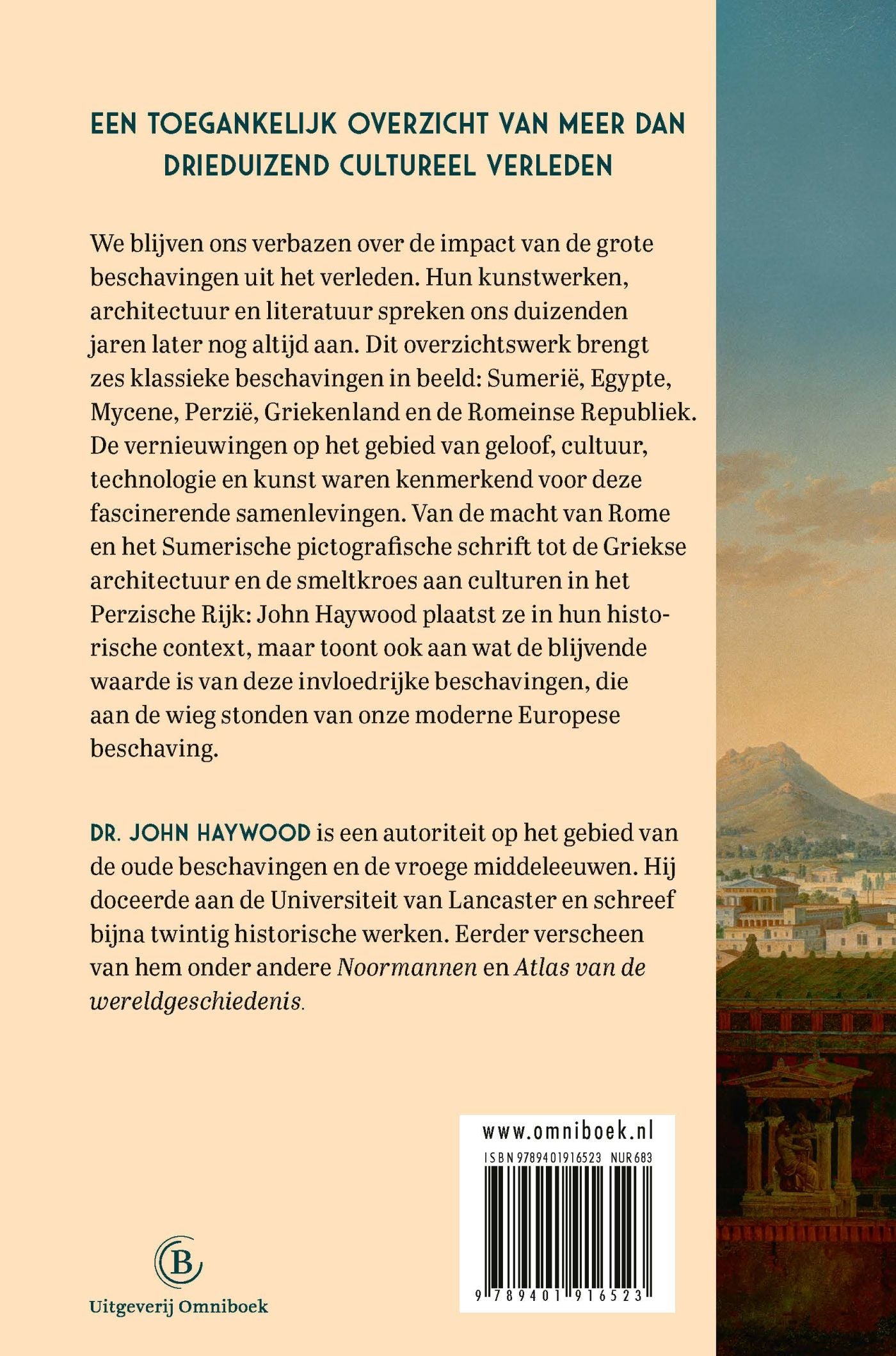 ‘De Klassieke beschaving’ is een voortreffelijk overzichtswerk, waarin auteur John Haywood laat zien waarom de invloed van de klassieke beschavingen nog altijd doorwerkt. De kunstwerken, architectuur en literatuur spreken ons na duizenden jaren nog steeds aan. Kenmerkend voor deze samenlevingen zijn de vernieuwingen op het gebied van geloof, cultuur, technologie en kunst. John Haywood brengt in ‘De Klassieke beschaving’ aan de hand van tal van afbeeldingen, kaarten, tijdsbalken en eigenzinnige theses de zes klassieke beschavingen in beeld: Sumerië, Egypte, Mycene, Perzië, Griekenland en Rome.