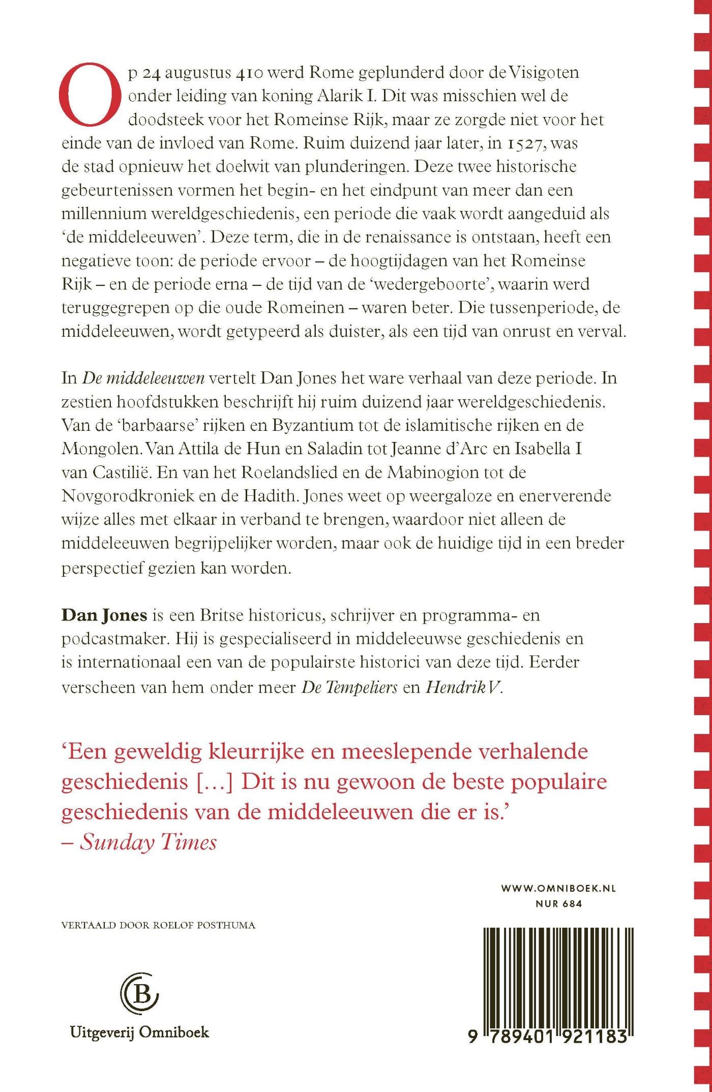 Een duizendjarig avontuur, dat is wat bestsellerauteur Dan Jones maakt van zijn nieuwe geschiedenis van ‘De middeleeuwen’. Hij begint in 410 bij de ineenstorting van het Romeinse Rijk en eindigt weer in Rome als keizer Karel V in de zestiende eeuw voor de poorten van de stad staat. In een duizelingwekkend tempo laat Jones zien hoe het Westen de oude wereld herbouwde en de rest van de wereld ging domineren: door te ontdekken, ontwikkelen of domweg te stelen. Hij werpt een nieuw licht op iconische locaties zoals Rome, Parijs, Venetië en Constantinopel, en enkele van de beroemdste en beruchtste mannen en vrouwen uit de geschiedenis betreden het toneel. ‘De middeleeuwen’ is een boek over – en voor – een tijd van diepgaande verandering.