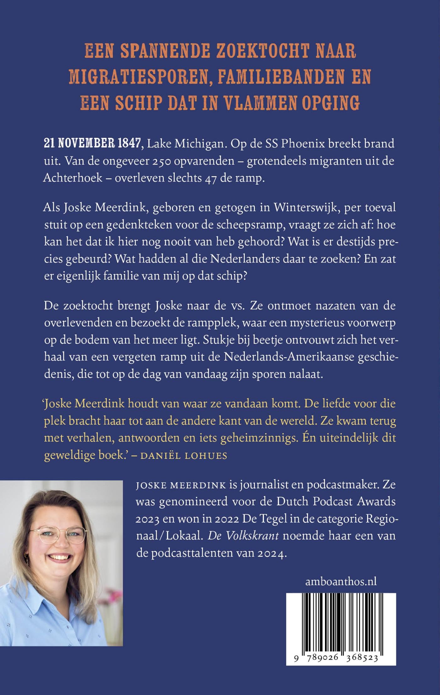 21 november 1847, Lake Michigan. Op de SS Phoenix breekt brand uit. Van de ongeveer 250 opvarenden – grotendeels migranten uit deAchterhoek – overleven slechts 47 de ramp. Als Joske Meerdink, geboren en getogen in Winterswijk, per toeval stuit op een gedenkteken voor de scheepsramp, vraagt ze zich af: hoe kan het dat ik hier nog nooit van heb gehoord? Wat is er destijds precies gebeurd? Wat hadden al die Nederlanders daar te zoeken? En zat er eigenlijk familie van mij op dat schip? De zoektocht brengt Joske naar de VS. Ze ontmoet nazaten van de overlevenden en bezoekt