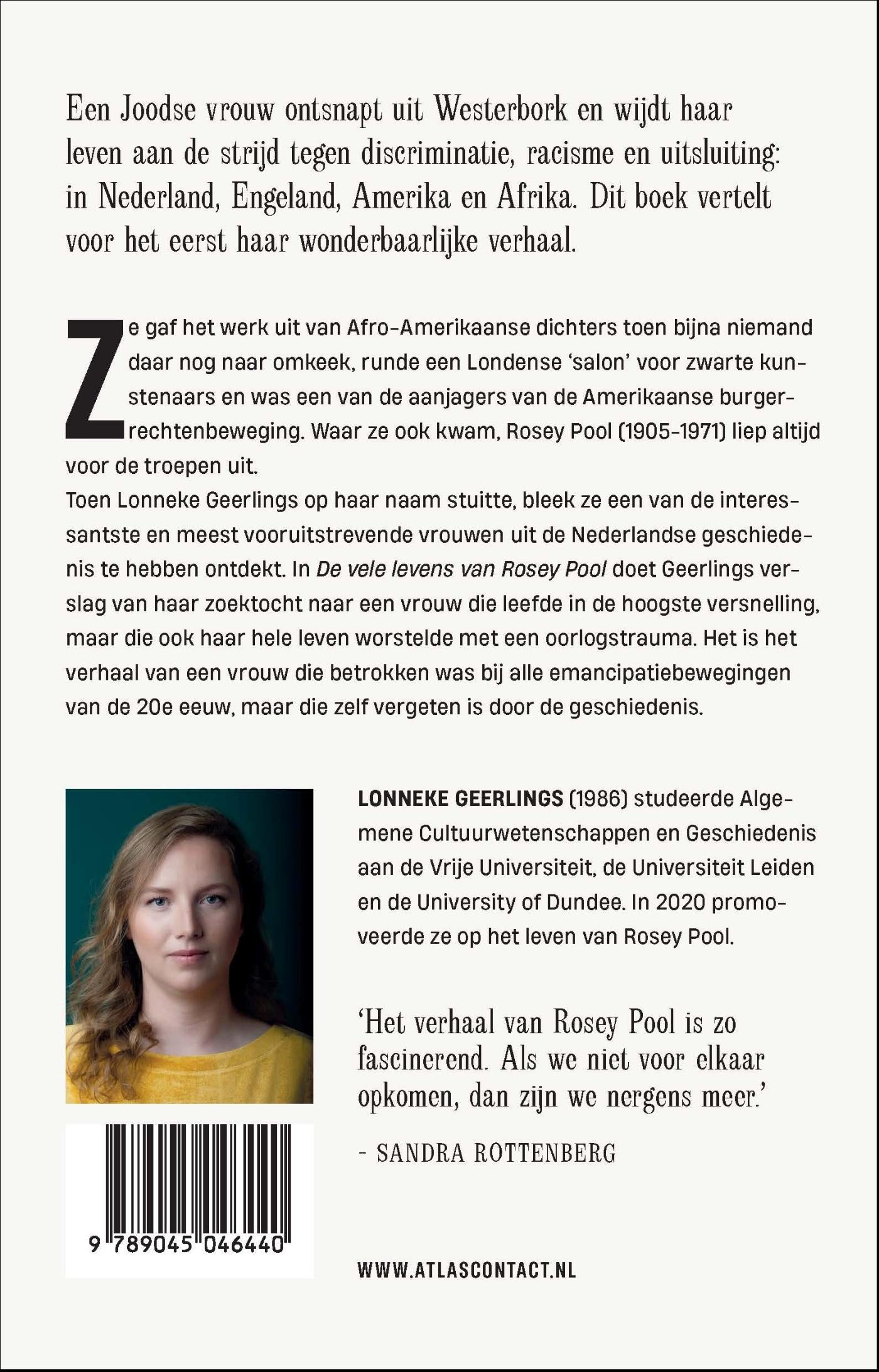 In ‘De vele levens van Rosey Pool’ doet Lonneke Geerlings verslag van haar zoektocht naar een vrouw die leefde in de hoogste versnelling, maar die ook haar hele leven worstelde met trauma. Rosey Pool (1905-1971) gaf het werk uit van Afro-Amerikaanse dichters toen bijna niemand daar nog naar omkeek, runde een Londense ‘salon’ voor zwarte kunstenaars en was een van de aanjagers van de Amerikaanse burgerrechtenbeweging. Achter de bloemetjesjurk van de bedeesde vertaalster en docente school een verbeten activiste en strijder voor sociale gelijkheid. Dit boek is het verhaal van de grote emancipatiebewegingen van de 20e eeuw, maar bovenal is dit het verhaal van een wonderbaarlijke vrouw die vergeten is door de geschiedenis.