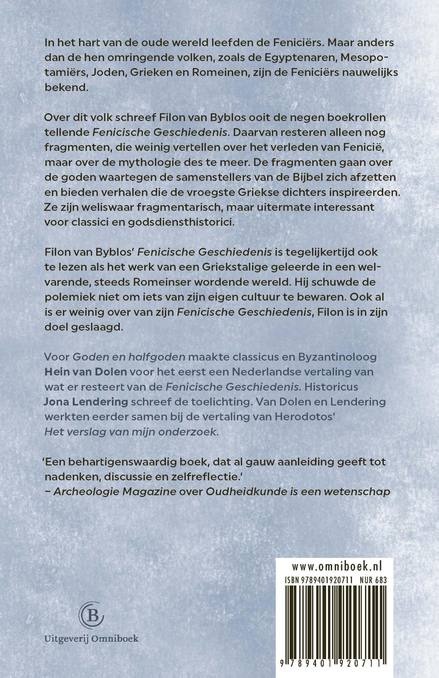 Voor ‘Goden en halfgoden’ maakte classicus en Byzantinoloog Hein van Dolen voor het eerst een Nederlandse vertaling van wat er resteert van de ‘Fenicische geschiedenis’. Historicus Jona Lendering schreef de toelichting. Van Dolen en Lendering werkten eerder samen bij de vertaling van Herodotos’ ‘Het verslag van mijn onderzoek’.