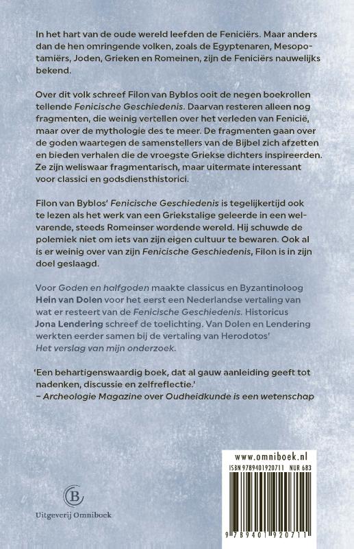 Voor ‘Goden en halfgoden’ maakte classicus en Byzantinoloog Hein van Dolen voor het eerst een Nederlandse vertaling van wat er resteert van de ‘Fenicische geschiedenis’. Historicus Jona Lendering schreef de toelichting. Van Dolen en Lendering werkten eerder samen bij de vertaling van Herodotos’ ‘Het verslag van mijn onderzoek’.