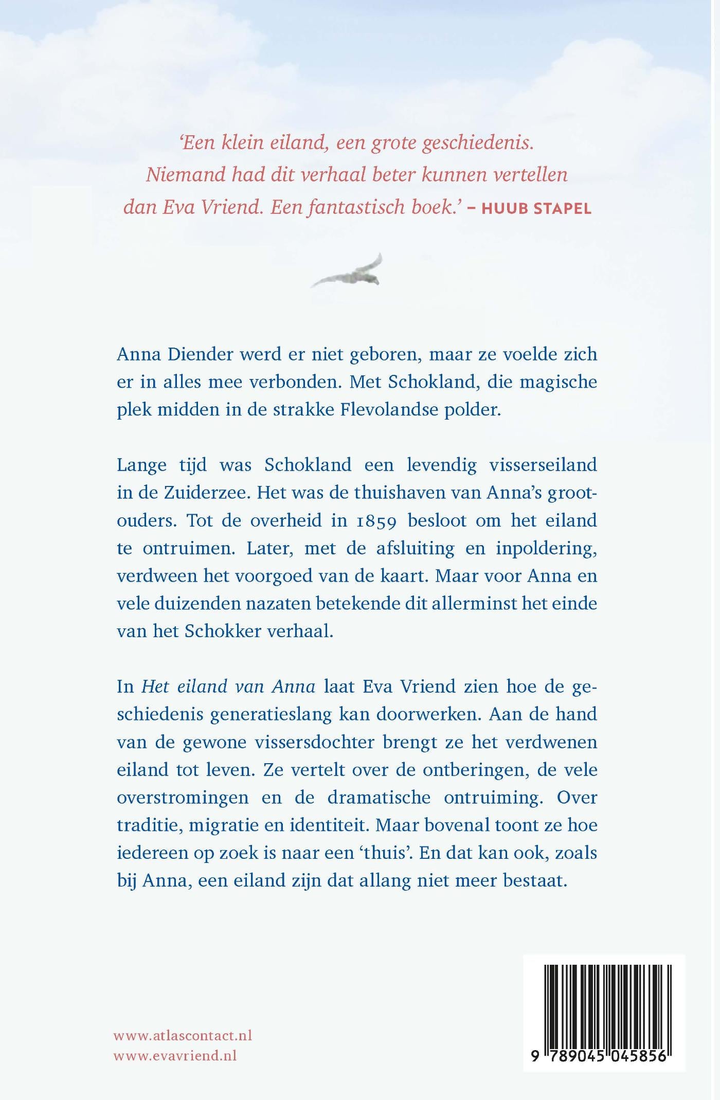 In Het eiland van Anna laat Eva Vriend zien hoe de geschiedenis generaties lang kan doorwerken. Aan de hand van de gewone vissersdochter brengt ze het verdwenen eiland tot leven. Ze vertelt over de ontberingen, de vele overstromingen en de dramatische ontruiming. Over wortels, migratie en identiteit. Maar bovenal gaat het over hoe iedereen op zoek is naar een ‘thuis’. En dat kan ook, zoals bij Anna, een eiland zijn dat allang niet meer bestaat.