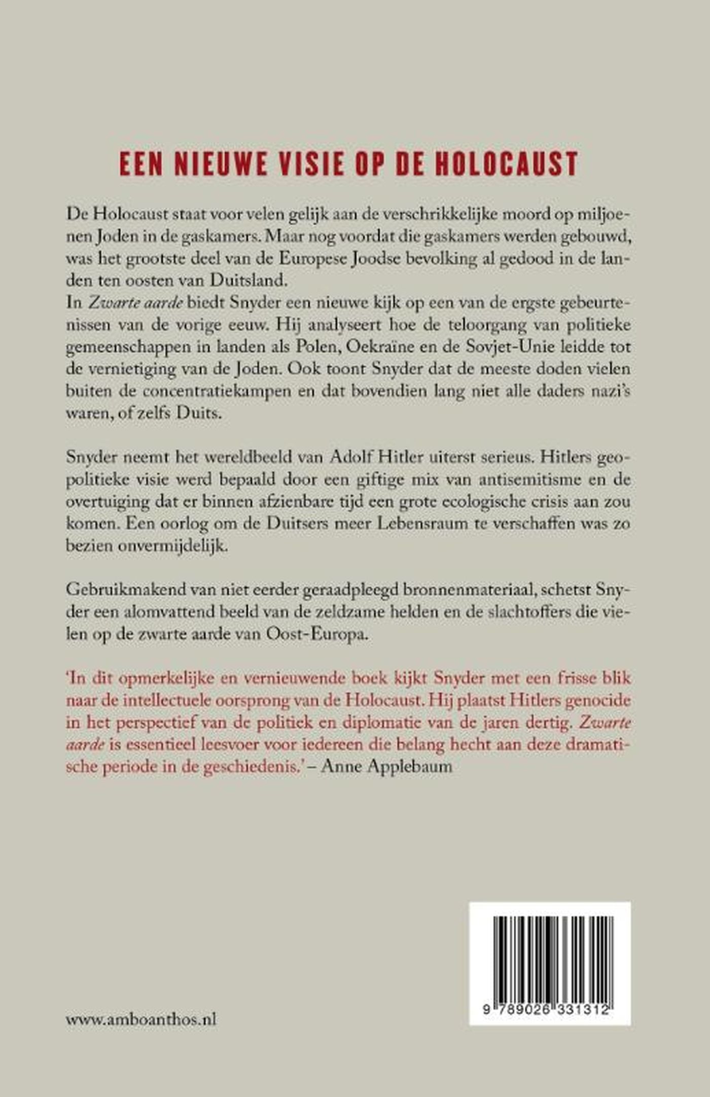 Zwarte aarde is een briljante en controversiële geschiedenis van de Holocaust. Snyder laat zien dat bepaalde ideeën en overtuigingen die in onze tijd leven dicht in de buurt komen bij de ecologische paniek die Hitler in de jaren dertig