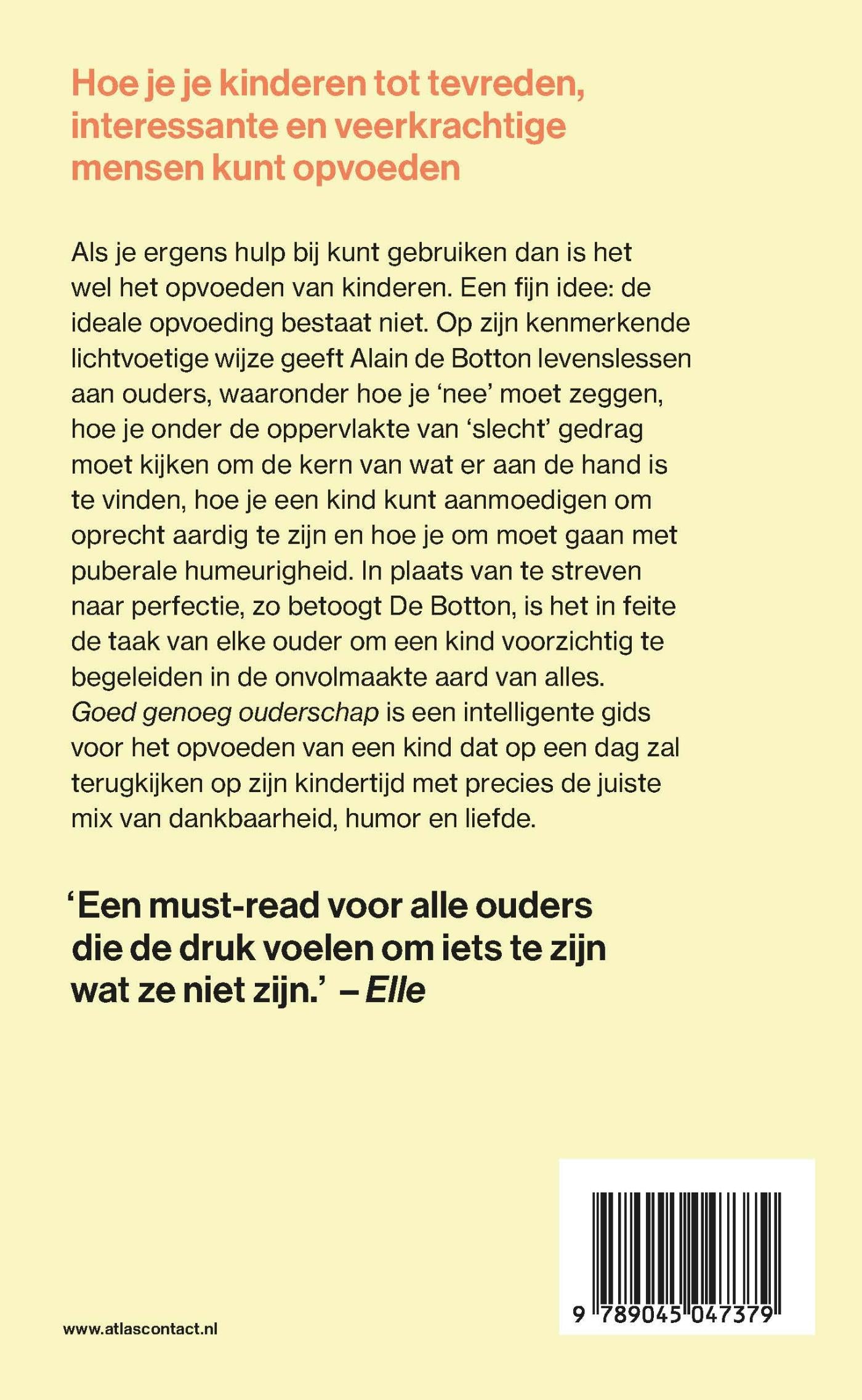 Als je ergens hulp bij kunt gebruiken dan is het wel het opvoeden van kinderen. Een fijn idee: de ideale opvoeding bestaat niet. Op zijn kenmerkende lichtvoetige wijze geeft Alain de Botton levenslessen aan ouders, waaronder hoe je ‘nee’ moet zeggen, hoe je onder de oppervlakte van ‘slecht’ gedrag moet kijken om de kern van wat er aan de hand is te vinden, hoe je een kind kunt aanmoedigen om oprecht aardig te zijn en hoe je om moet gaan met puberale humeurigheid. In plaats van te streven naar perfectie, zo betoogt De Botton, is het in feite de taak van elke ouder om een kind voorzichtig te begeleiden in de onvolmaakte aard van alles.