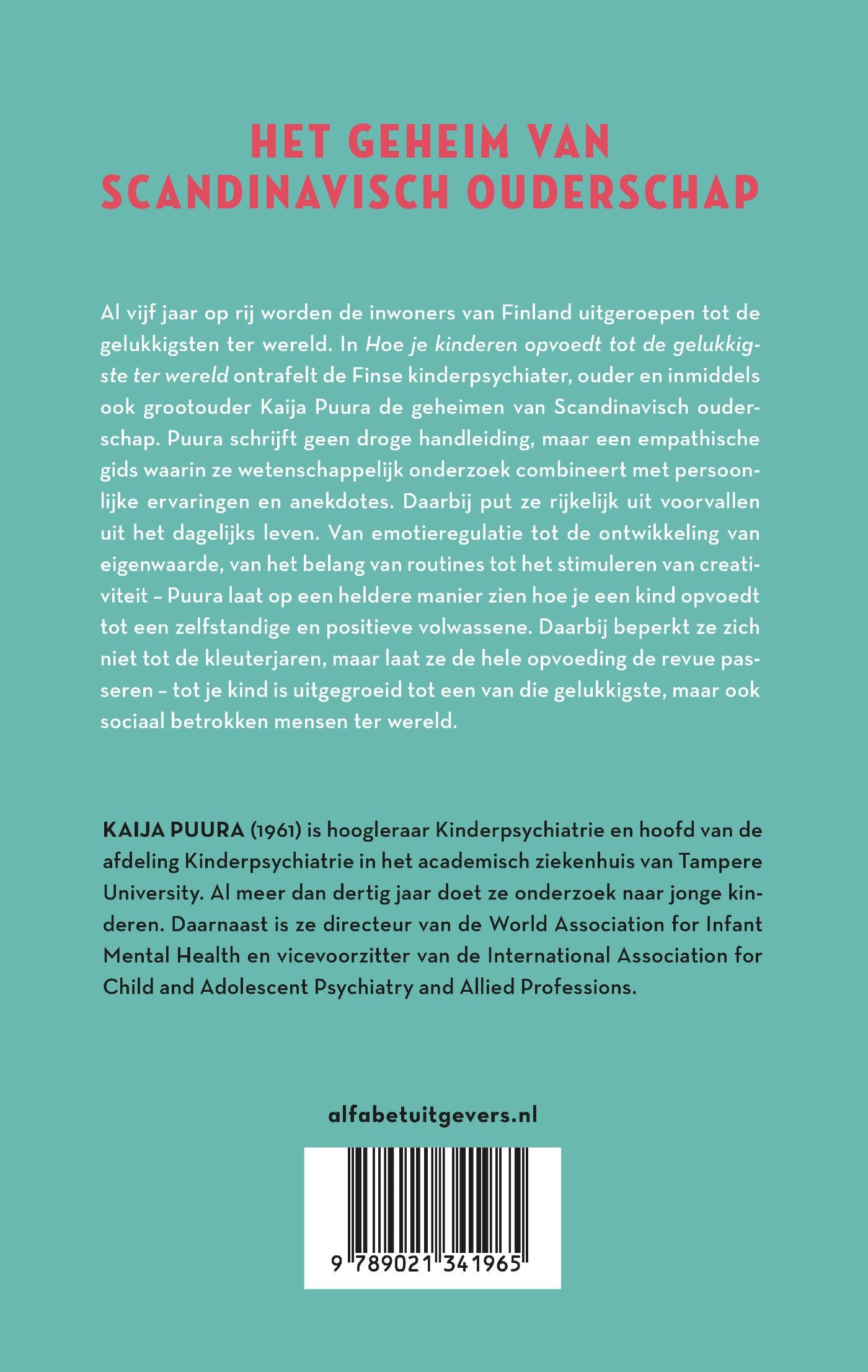 Al vijf jaar op rij worden de inwoners van Finland uitgeroepen tot de gelukkigsten ter wereld. In ‘Hoe je kinderen opvoedt tot de gelukkigste ter wereld’ ontrafelt kinderpsychiater, ouder en inmiddels ook grootouder Kaija Puura de geheimen van Scandinavisch ouderschap. Puura schrijft geen droge handleiding, maar een empathische gids waarin ze wetenschappelijk onderzoek combineert met persoonlijke ervaringen en anekdotes. Daarbij put ze rijkelijk uit voorvallen uit het dagelijks leven. Van emotieregulatie tot de ontwikkeling van eigenwaarde, van het belang van routines tot het stimuleren van creativiteit – Puura laat op een heldere manier zien hoe je een kind opvoedt tot een zelfstandige en positieve volwassene. Daarbij beperkt ze zich niet tot de kleuterjaren, maar laat ze de hele opvoeding de revue passeren – tot je kind is uitgegroeid tot een van die gelukkigste, maar ook sociaal betrokken mensen ter wereld.