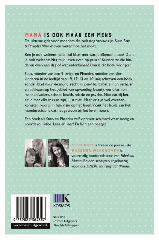 Mama is ook maar een mens van Suus Ruis en Phaedra Werkhoven is de ultieme gids voor moeders die ook nog vrouw zijn. Als moeder word je continu voor keuzes gesteld. En door de brij aan meningen kun je behoorlijk vastlopen. Klaar met dat moedergemuts: Suus en Pheadra leggen uit hoe het moet! Scherp maar met een knipoog geven zij hun ongezouten mening over de trends op het gebied van opvoeding, mannen, relaties, werk en beauty.