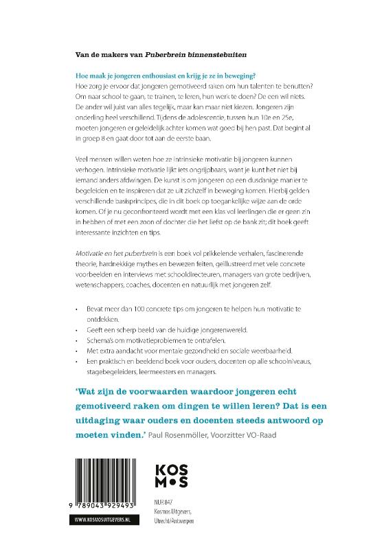 Yvonne van Sark en Huub Nelis laten bondig zien wat er bekend is over de invloed van o.a. opvoeding op motivatie vanuit de wetenschap en wat experts erover zeggen. Hierdoor krijg je meer inzicht in hoe het puberbrein werkt en wat er nodig is om natuurlijke nieuwsgierigheid aan te wakkeren. Nelis en Van Sark geven deze inzichten vervolgens ook een praktische invulling: hoe praat je met je kind? Hoe ga je om met belonen? Hoe creëer je gunstige omstandigheden voor gedrevenheid?