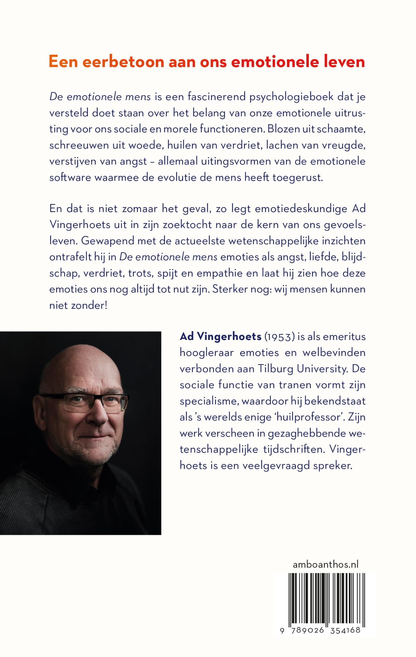De emotionele mens van Ad Vingerhoets geeft de actueelste inzichten over het belang van alle menselijke emoties. Blozen uit schaamte, schreeuwen uit woede, huilen van verdriet, lachen van vreugde, verstijven van angst – allemaal uitingsvormen van de emotionele software waarmee de evolutie de mens heeft toegerust. En dat is niet zomaar, zo legt emotiedeskundige Ad Vingerhoets uit in deze fascinerende zoektocht naar de kern van ons gevoelsleven. Gewapend met de actueelste wetenschappelijke inzichten ontrafelt hij in De emotionele mens de kern van menselijke emoties als angst, blijdschap, verdriet, trots, spijt, nostalgie en walging én laat hij zien hoe deze emoties ons nog altijd tot nut zijn. Sterker nog: we kunnen niet zonder!