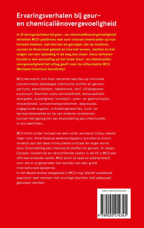 'Ervaringsverhalen bij geur- en chemicaliënovergevoeligheid' is een aanvulling op het boek 'Geur- en chemicaliënovergevoeligheid' over de milieuziekte MCS (Multiple Chemical Sensitivity) van Geerteke de Haas. In deze aanvullende verhalenbundel vertellen MCS-patiënten welke invloed chemicaliën op hun lichaam hebben, wat hiervan de gevolgen zijn op medisch, sociaal en financieel gebied en hoe het wonen, werken en het volgen van een opleiding in de weg kan staan. MCS kenmerkt zich door extreme reacties op minimale concentraties alledaagse chemische stoffen en geuren: parfums, wasmiddelen, tabaksrook, verf, uitlaatgassen enzovoort. Klachten zoals vermoeidheid, benauwdheid, allergieën, duizeligheid, hoofdpijn, spier- en gewrichtspijn, misselijkheid, concentratieproblemen, depressies, ongegronde angsten, ontstekingsreacties en huid- en darmproblematiek kunnen het gevolg zijn van blootstelling aan chemicaliën in ons leefmilieu. MCS komt onder invloed van een vuiler wordend milieu steeds meer voor. Amerikaanse wetenschappers toonden al onomstotelijk aan dat deze milieuziekte ontstaat én erger wordt door blootstelling aan chemische stoffen en geuren. In Japan, Canada, Oostenrijk en verschillende staten in de VS is MCS een officieel erkende ziekte. MCS komt zó vaak en wijdverbreid voor dat er al gesproken kan worden van een grote internationale epidemie. In het Nederlandse taalgebied is MCS nog relatief onbekend, waardoor veel mensen met ernstige klachten niet adequaat geholpen worden