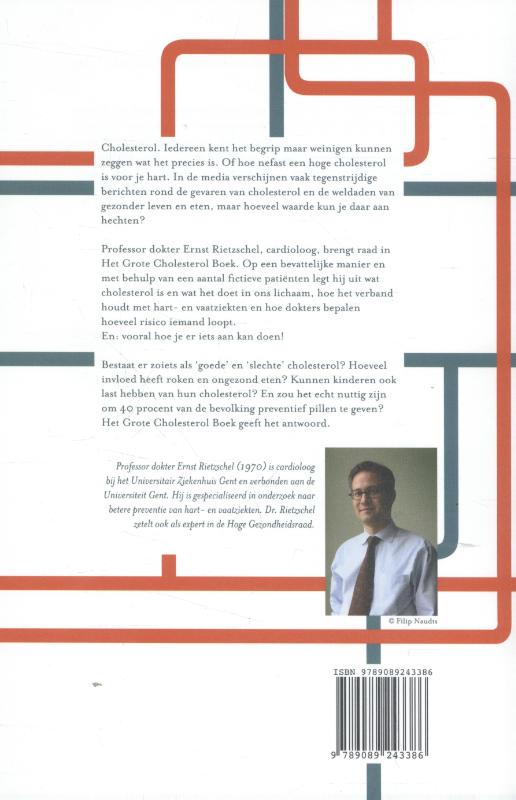 Professor dokter Ernst Rietzschel, cardioloog, brengt raad in Het Grote Cholesterol Boek. Op een bevattelijke manier en met behulp van een aantal fictieve patiënten legt hij uit wat cholesterol is en wat het doet in ons lichaam, hoe het verband houdt met hart- en vaatziekten en hoe dokters bepalen hoeveel risico iemand loopt. En: vooral hoe je er iets aan kan doen!