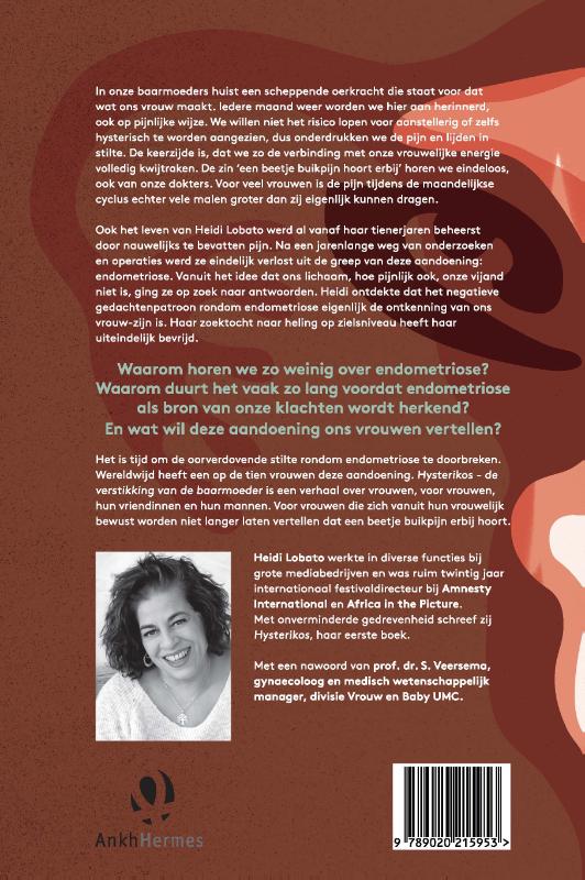 Hysterikos, de verstikking van de baarmoeder van Heidi Lobato is een aangrijpend en persoonlijk verhaal over een onbekende en ongeneeslijke aandoening: endometriose. Waarom horen en lezen we zelden over deze aandoening en kennen veel vrouwen deze aandoening zelf niet eens? Vroeger werden vrouwen die hieraan leden weggezet als hysterisch en aanstellerig, maar de pijn van endometriose is niet te vergelijken met ‘normale’ menstruatiepijn. Het kan zelfs aanvoelen alsof je letterlijk doodgaat. Zo dacht ook Heidi dood te gaan daar op de operatietafel bij die vijfde of zesde, en ze dacht laatste, operatie. Een aandoening die haar dertig jaar lang in de greep hield en die zij bijna niet overleefde.