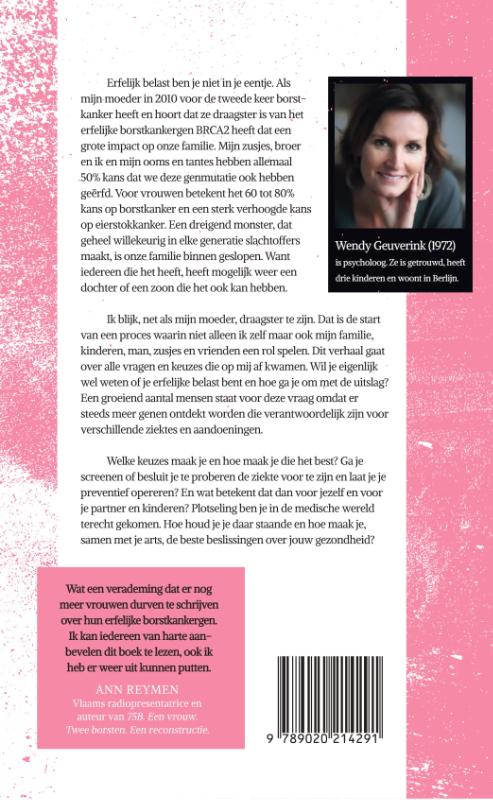 'In mijn familie - Moeilijke medische keuzes rond ziekte en erfelijke aanleg' van Wendy Geuverink is van belang voor iedereen die voor belangrijke keuzes staat op het gebied van gezondheid. In haar boek beschrijft Wendy Geuverink haar persoonlijke verhaal, dat begint als ze eind 2010 te horen krijgt dat ze drager is van het erfelijke borstkankergen BRCA2. Dit borstkankergen is recent veel bekender geworden door Angelina Jolie, die haar medische keuzes openlijk in de media heeft gedeeld nadat ze zichzelf ook geconfronteerd zag met BRCA. Een BRCA2 genmutatie betekent 60 tot 80% kans op het krijgen van borstkanker en een aanzienlijk verhoogde kans op eierstokkanker. Wendy beschrijft op een indringende manier wat dit voor haar en haar gezin betekent en welke ingrijpende keuzes zij maakt om in haar gezonde lijf diverse malen preventief in te grijpen. Naast haar persoonlijke verhaal en zoektocht beschrijft ze helder wat moeilijke medische keuzes inhouden voor iedereen die geconfronteerd wordt met een erfelijke aanleg of een ziekte met ernstige consequenties. Ze wil door haar verhaal en door informatie en adviezen over onderwerpen als 'gedeelde besluitvorming met je arts', 'wil je wel weten of je zelf ook erfelijk belast bent?' en 'hoe blijf je goed in contact met je familie, partner en kinderen?' die groep een steun in de rug geven.
