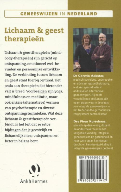 Lichaam & Geesttherapieën is het zevende deel in de nieuwe AnkhHermes-serie Geneeswijzen in Nederland. Eerder verschenen al Natuurgeneeskunde, Kruidengeneeskunde, Chinese geneeskunde, Ayurvedische geneeskunde, Antroposofische geneeskunde en Homeopathie. De serie zal in de zomer van 2016 compleet zijn (12 delen) en omvat de belangrijkste alternatieve geneeswijzen. Er is veel belangstelling voor alternatieve geneeswijzen, en er is ook heel veel over te vinden op internet. Maar hoe weet je of deze informatie betrouwbaar is? AnkhHermes biedt met deze serie de meest up-to-date informatie, op een begrijpelijke manier geschreven door medische professionals. Wegwijs in een uur!