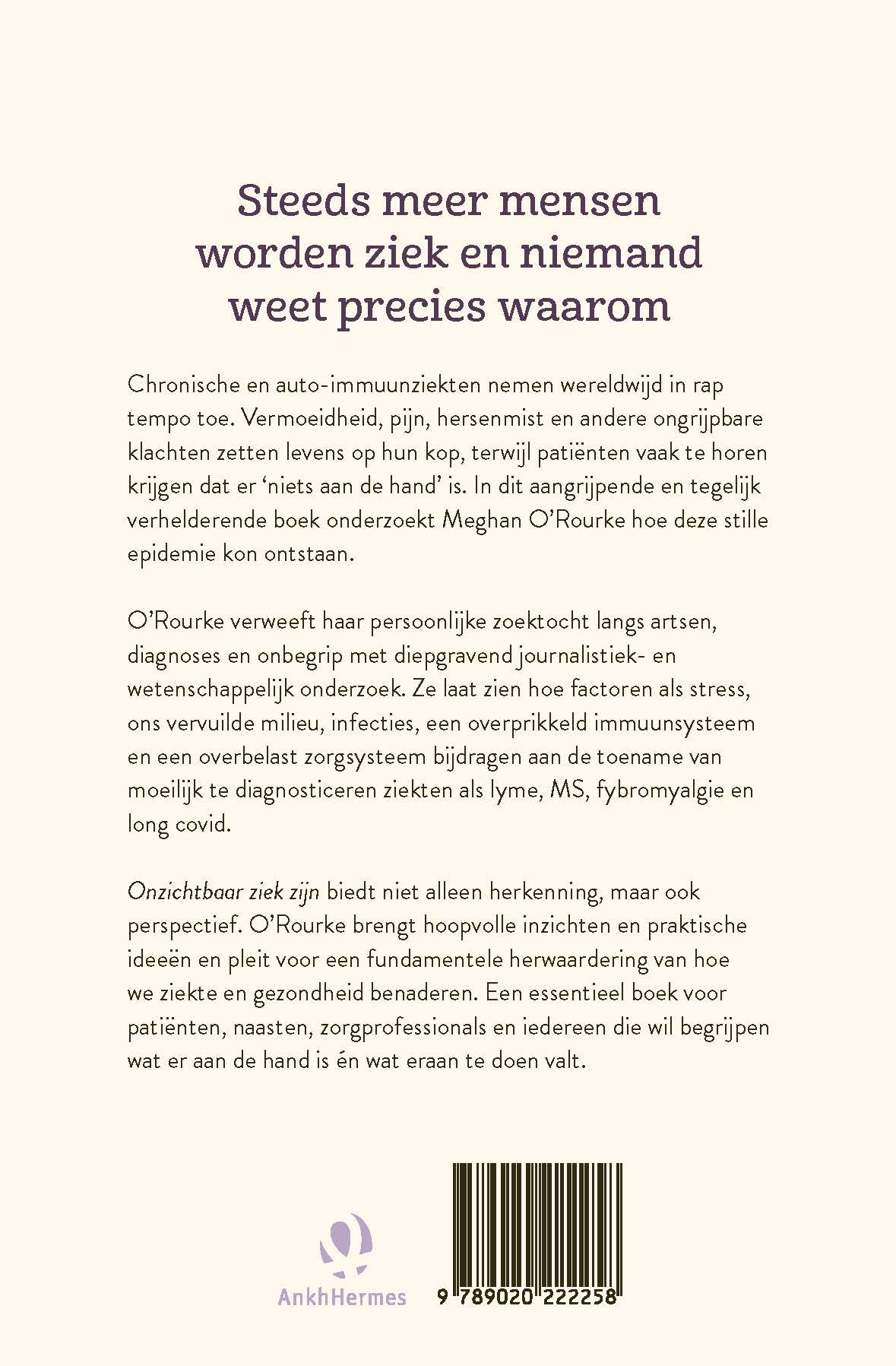 Onzichtbaar ziek zijn van Meghan O'Rourke is geschreven voor iedereen met een chronische of auto-immuunziekte. In Nederland zijn dit bijna 10 miljoen mensen (53% van de volwassenen). Van long covid tot Lyme, van diabetes type 1 tot hypermobiliteit: dat steeds meer mensen chronisch ziek zijn of een auto-immuunziekte hebben is een van de meest ingrijpende en mysterieuze problemen van onze tijd .