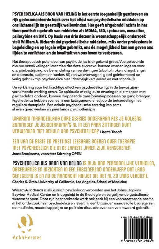 'Psychedelica als bron van heling, ervaringsverhalen en belangrijke doorbraken' van William A. Richards is een van de belangrijkste boeken op het gebied van complementaire geneeswijzen dat de afgelopen tijd is verschenen. Wetenschapper William Richards doet al decennia lang onderzoek naar de helende en transformerende werking van psychedelica, waaronder ayahuasca, MDMA, cannabis en LSD. De cases in 'Psychedelica als bron van heling' zijn hoopvol voor zowel psychische als lichamelijke aandoeningen. Behandelingen bij bijvoorbeeld depressies en verslavingen blijken veel succesvoller als ze ondersteund werden door psychedelica in plaats van traditionele medicatie. Dit boek is een fantastisch naslagwerk voor wie op zoek is naar betrouwbare informatie over andere manieren van genezen dan met alleen reguliere medicatie.