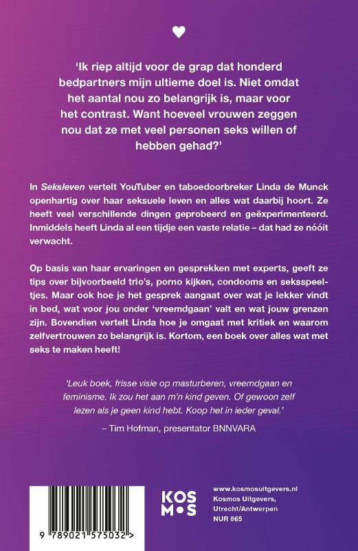 In Seksleven vertelt YouTuber, spreker en taboedoorbreker Linda de Munck openhartig over haar seksuele leven en alles wat daarbij komt kijken. In haar seksuele verleden heeft ze veel verschillende dingen geprobeerd en geëxperimenteerd. Inmiddels heeft Linda al een tijdje een vaste relatie. Op basis van haar ervaringen én informatie van experts, geeft ze tips over uiteenlopende onderwerpen als trio’s, pornokijken, condoomgebruik en seksspeeltjes. Maar ook over hoe je het gesprek met je vriend of vriendin aangaat over wat je lekker vindt in bed, wat voor jou onder ‘vreemdgaan’ valt en wat jouw grenzen zijn. Bovendien vertelt ze hoe je omgaat met kritiek en waarom zelfvertrouwen zo belangrijk is. Kortom, een boek over seks en alles wat met seks te maken heeft!