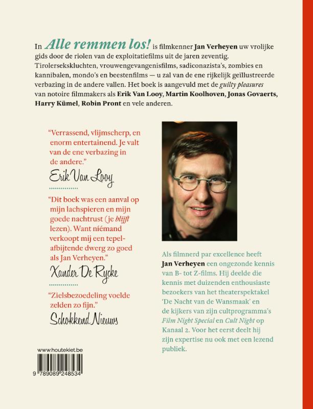 In Alle remmen los! is filmkenner Jan Verheyen uw vrolijke gids doorheen de riolen van de exploitatiefilms uit die tijd. Tirolersekskluchten, vrouwengevangenisfilms, sadiconazista’s, zombies en kannibalen, mondo’s en beestenfilms – u zal van de ene rijkelijk geïllustreerde verbazing in de andere vallen. Het boek is aangevuld met de guilty pleasures van notoire filmmakers als Erik Van Looy, Martin Koolhoven, Jonas Govaerts, Harry Kümel, Robin Pront en vele anderen.