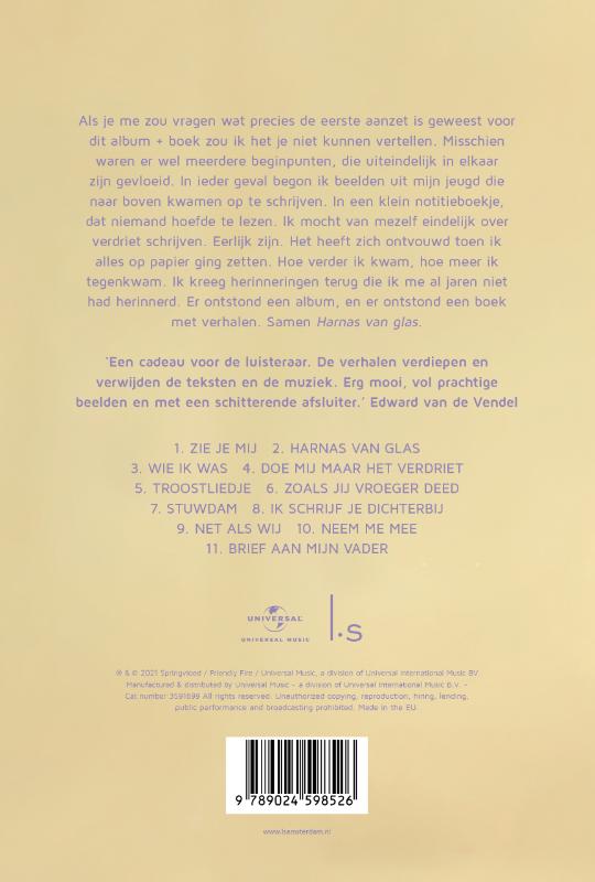 Harnas van glas is het nieuwe, derde album van Maaike Ouboter, en de cd is exclusief verkrijgbaar bij het gelijknamige boek. In dit unieke werk worden alle elf songteksten van het album begeleid door een autobiografisch verhaal van Ouboter, die inmiddels in binnen- en buitenland bekend is om haar indrukwekkende teksten.