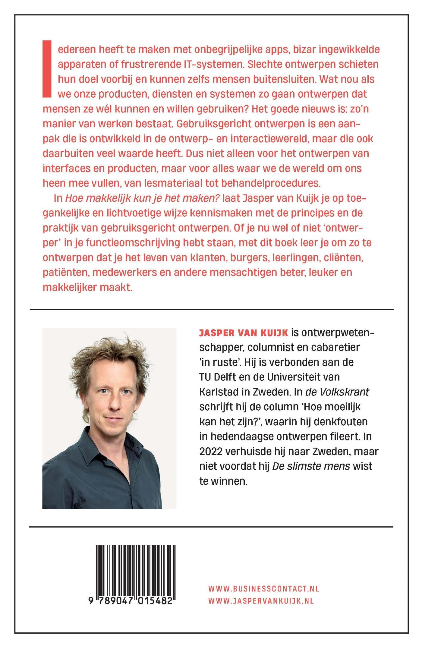 In Hoe makkelijk kun je het maken? laat Jasper van Kuijk je op toegankelijke en lichtvoetige wijze kennismaken met de principes en de praktijk van gebruiksgericht ontwerpen. Of je nu wel of niet ontwerper in je functieomschrijving hebt staan, met dit boek leer je om zo te ontwerpen dat je het leven van klanten, burgers, leerlingen, cliënten, patiënten, medewerkers en andere mensachtigen beter, leuker en makkelijker maakt.