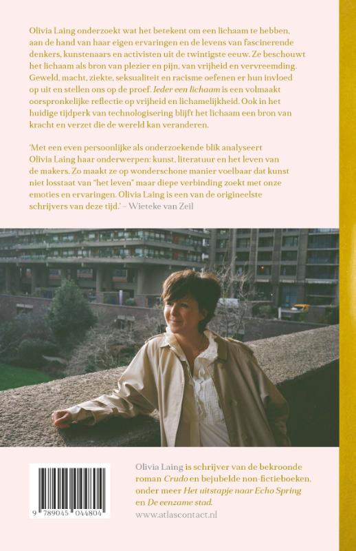 In ‘Ieder een lichaam’ onderzoekt Olivia Laing wat het betekent om een lichaam te hebben, aan de hand van haar eigen ervaringen en de levens van de meest fascinerende denkers uit de twintigste eeuw. Ieder een lichaam is een volmaakt oorspronkelijke reflectie op vrijheid en lichamelijkheid van een schrijver met een onafhankelijke geest, oog voor complexiteit en een glasheldere pen. Want ook in het tijdperk van technologisering en automatisering blijft het lichaam een bron van kracht en verzet die de wereld kan veranderen.