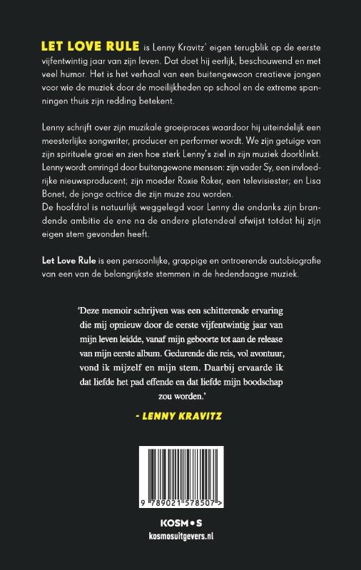 In zijn langverwachte autobiografie vertelt rockster Lenny Kravitz, zoon van een Joodse vader en een Afro-Amerikaanse moeder hoe hij uitgroeide van verlegen jongen tot artiest met internationale sterrenstatus. Het boek beschrijft de eerste 25 jaar van zijn leven. Lenny is zeer openhartig over alle facetten van zijn jonge jaren. Over zijn relatie met zijn ouders, hun scheiding, maar ook over platenbazen die aanvankelijk geen idee hadden hoe ze hem in de markt moesten zetten (‘Prince meets John Lennon’). Let Love Rule is een persoonlijke, grappige en ontroerende autobiografie van een van de belangrijkste stemmen in de hedendaagse muziek.