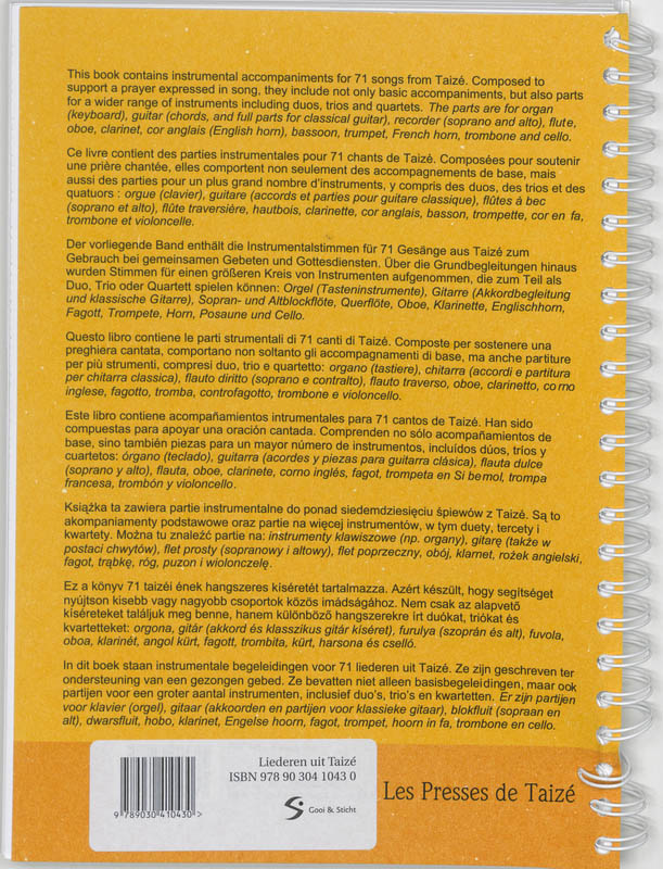 In dit boek staan instrumentale begeleidigen voor 71 liederen uit Taizé. Ze zijn geschreven ter ondersteuning van een gezongen gebed. Ze bevatten niet alleen basisbegeleidingen, maar ook partijen voor een groter aantal instrumenten, inclusief duo's, trio's en kwartetten.