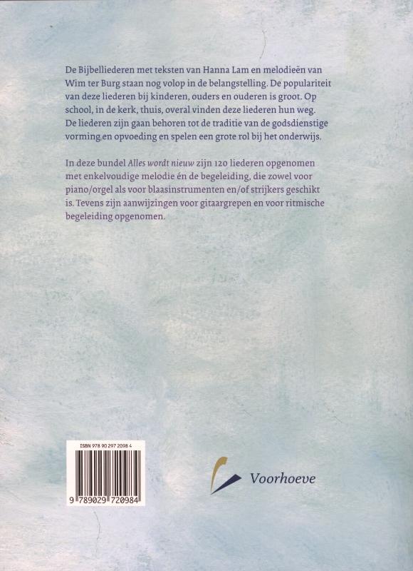 In deze bundel Alles wordt nieuw zijn 120 liederen opgenomen met enkelvoudige melodie én de begeleiding, die zowel voor piano/orgel als voor blaasinstrumenten en/of strijkers geschikt is. Tevens zijn aanwijzingen voor gitaargrepen en voor ritmische begeleiding opgenomen.