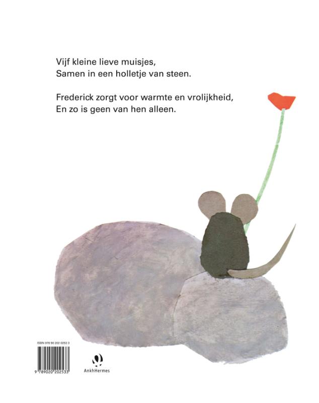 In 'Frederick' van Leo Lionni wonen vijf kleine lieve muisjes samen in een holletje van steen. Ze werken dag en nacht om eten te verzamelen, behalve Frederick. Die verzamelt zonnestralen en kleuren en zorgt zo voor warmte en vrolijkheid.