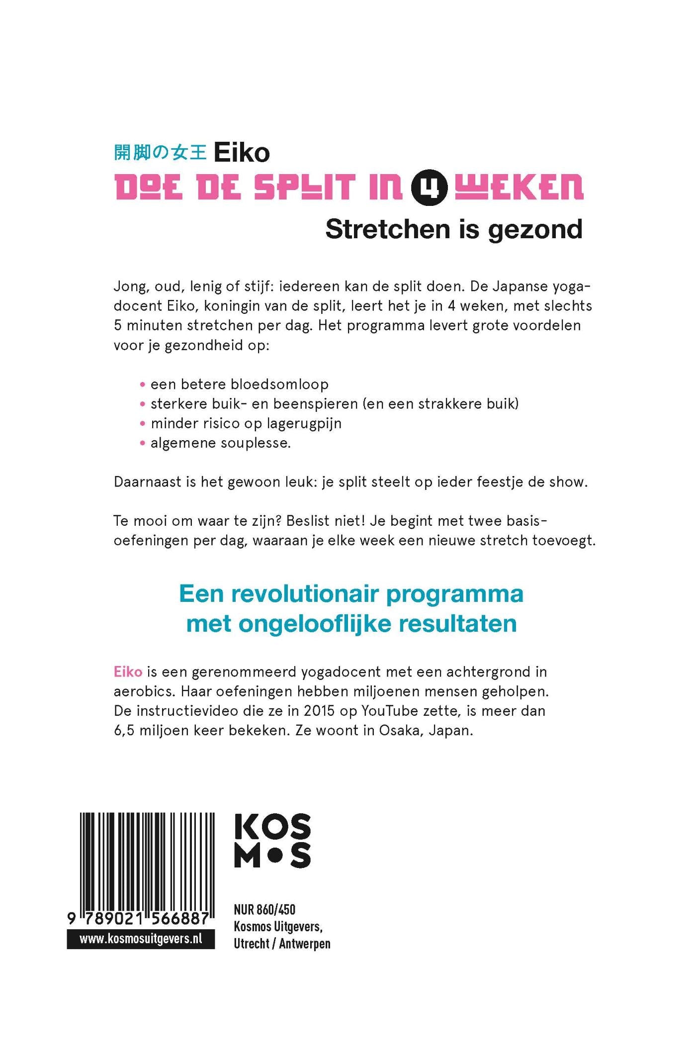 De Japanse yogadocent Eiko, koningin van de split, leert je met ‘Doe de split in vier weken’ in 4 weken de split te doen. Iedereen kan de split doen: jong, oud, lenig of stijf! Met slechts vijf minuten stretchen per dag kun ook jij je flexibiliteit verbeteren.