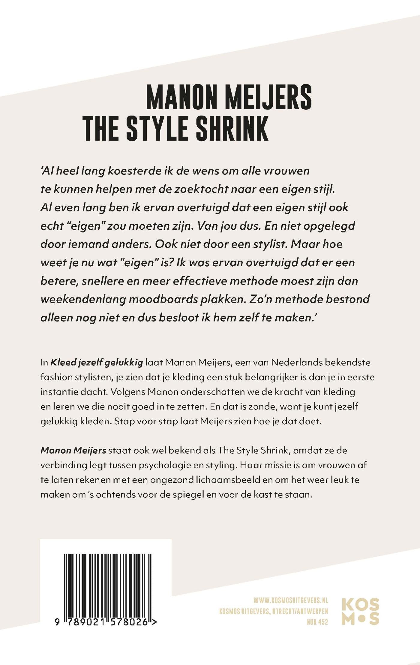 In Kleed Jezelf Gelukkig laat Manon Meijers, een van Nederlands bekendste fashion stylisten, je zien dat je kleding een stuk belangrijker is dan je in eerste instantie dacht. Volgens Manon onderschatten we de kracht van kleding en leren we die nooit goed in te zetten. En dat is zonde, want je kunt jezelf gelukkig kleden. Stap voor stap laat Meijers zien hoe je dat doet. Ze ontvouwt haar foolproof methode om tot een eigen stijl te komen die écht bij je past, zonder dat je daarvoor weekenden lang moodboards hoeft te plakken. Meijers staat ook wel bekend als The Style Shrink omdat ze de verbinding maakt tussen psychologie en styling. Haar missie is om vrouwen af te laten rekenen met een ongezond lichaamsbeeld en om het leuk te maken om ’s ochtends voor de spiegel en voor de kast te staan.