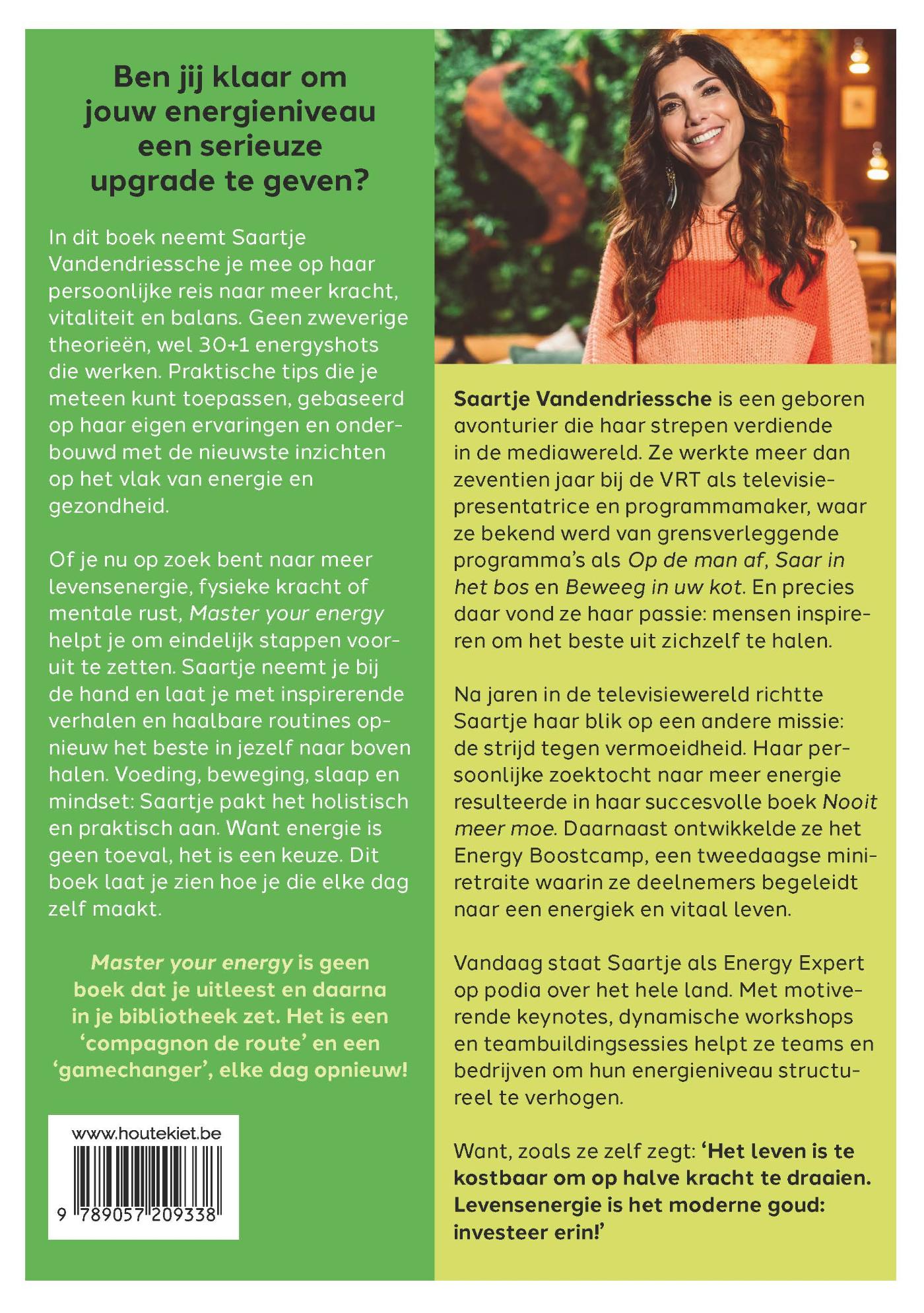 Of je nu op zoek bent naar meer lichamelijke energie, fysieke kracht of mentale rust, Master your energy helpt je om eindelijk stappen vooruit te zetten. Saartje neemt je bij de hand en laat je met inspirerende verhalen en haalbare routines opnieuw het beste in jezelf naar boven halen. Voeding, beweging, slaap en mindset: Saartje pakt het holistisch en praktisch aan. Want energie is geen toeval, het is een keuze. En dit boek laat je zien hoe je die elke dag zelf maakt.