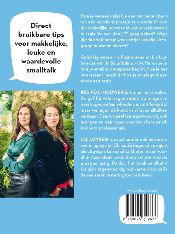 Gelukkig weten Iris Posthouwer en Liz Luyben dat wel. In Smalltalk survival leren ze je hoe je smalltalk soepeler begint, hoe je het interessant maakt én hoe je er elegant een einde aan breit.